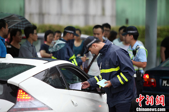 台风“尤特”袭击澳门期间,澳门治安警察局针对过往在台风期间,车辆非法营运及的士拒载的交通违规情况,14日部署特别行动小组加强打击,以改善交通秩序及减少违规行为。图为警察在检控车辆非法营。中新社发 龙土有 摄
