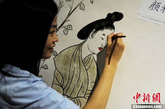 8月20日,一位博物馆的工作人员正在对壁画进行描绘。中新社发 张远 摄