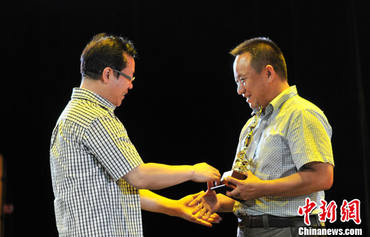 8月19日晚,中国舞蹈家协会常务副主席冯双白(左)为获得金奖的西宁艺术剧院有限公司颁奖。第二届青海·西宁国际舞蹈节暨第九届中国舞蹈“荷花奖”古典舞大赛当晚圆满落幕。中新社发 胡友军 摄