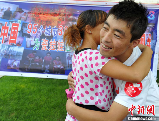 8月20日,河北石家庄一公园门口,内蒙古拱背青年那苏图向过往市民求拥抱。图为女市民献给那苏图第2360个拥抱。中新社发 翟羽佳 摄