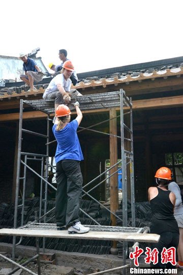8月20日,来自中、法两国的志愿者齐聚江苏苏州平江路,一同参与文物古建的修复工作。图为中法志愿者现场搬瓦。中新社发 王思哲 摄