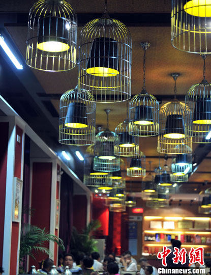 8月20日,食客们在武汉一家挂有鸟笼造型吊灯的川菜馆里进餐。中新社发 张畅 摄