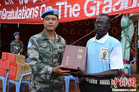 图为中国维和部队向帮扶中心赠送《论语(中英文)》。中新社发 管永强 摄