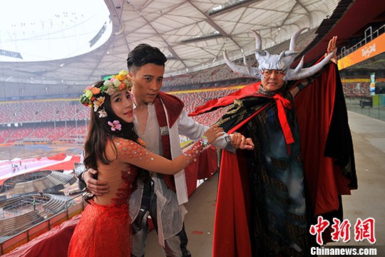 8月21日,2013《鸟巢·吸引》演出季的几名演员在鸟巢看台上进行即兴表演。据悉,今年的鸟巢视听驻场秀《鸟巢·吸引》将讲述一个人与人、人与自然、人与社会和谐相处的故事,演出将从9月12日持续到10月7日。中新社发 李慧思 摄