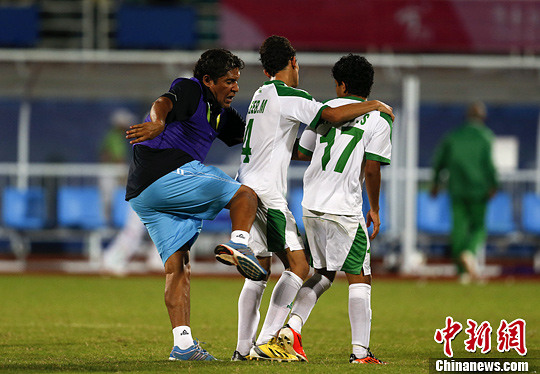 8月21日,亚青会男足半决赛结束后,伊拉克队球员被教练“教训”。中新社发 刘关关 摄