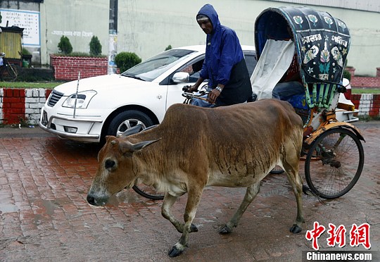 8月下旬,正处雨季的孟加拉国第二大城市吉大港街头,一头牛、一辆当地最流行的人力三轮车和一辆汽车并行于道路上。中新社发 张浩 摄