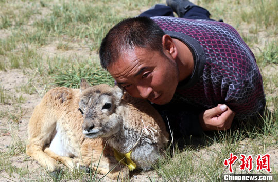 8月22日,8月22日,世界海拔最高的动物救护中心——可可西里野生动物救护中心的工作人员孟克和被救治的小藏羚羊亲密接触。中新社发 赵凛松 摄