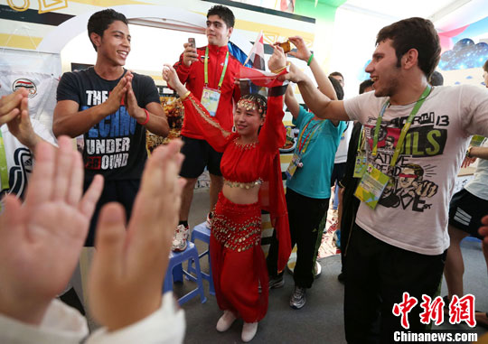 8月22日,在南京参加第二届亚洲青年运动会的亚洲各国和地区的参赛运动员、教练们走进设立在亚青会运动员村的亚青小屋,体验感受不同地域的文化与特色。图为参赛运动员和南京的中学生在文化小屋前一起跳舞。泱波 摄