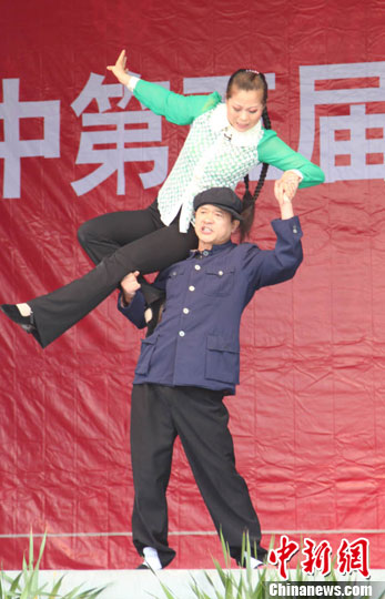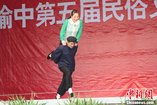 方言版小品《背媳妇》,节目内容大致为一未婚大龄男子为帮助一未婚女子过河时只能采用“背”的方式,后结为夫妻的美好故事,其诙谐幽默的语言逗得观众捧腹大笑。刘玉桃 摄