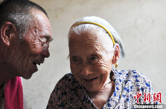 8月22日,1914年出生的长清孝里金村村百岁老人方玉兰与年过七旬的儿子交谈。中新社发 张勇 摄