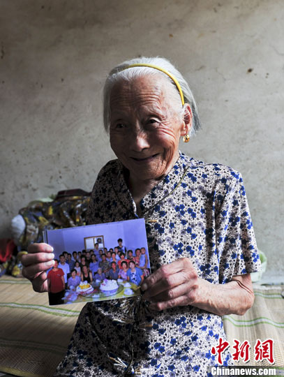 8月22日,1914年出生的济南长清孝里百岁老人方玉兰手持全家福照片喜上眉梢。中新社发 张勇 摄
