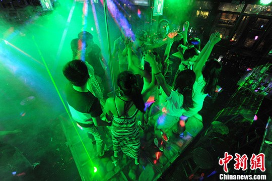 8月22日晚,众多游客正在湖南凤凰古城的北一门酒吧内狂欢。杨华峰 摄