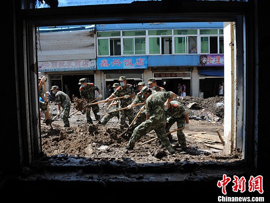 8月22日,辽宁抚顺洪涝重灾区清原县南口前镇,武警辽宁总队官兵正在清理淤泥。中新社发 吴成钢 摄