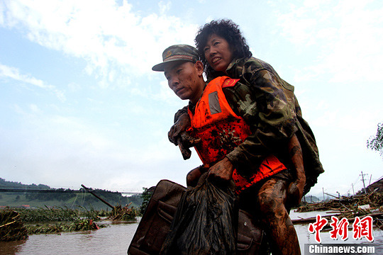 8月22日,辽宁抚顺清原县南口前镇,武警辽宁总队官兵解救一名被洪水围困的民众。中新社发 吴成钢 摄