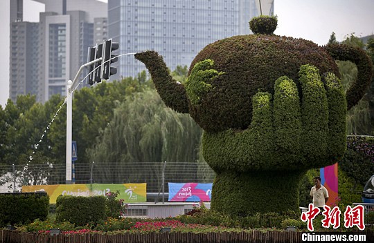 8月23日,一组植物版茶壶亮相南京街头,惟妙惟肖的造型不仅展示了园艺工人的手艺,也为城市增添了一道新的景观。中新社发 泱波 摄