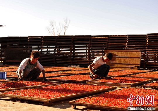8月22日,工人正在晾晒采摘的枸杞鲜果。中新社发 郭雪媛 摄