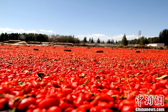 青海诺木洪农场枸杞产业园区的枸杞晾晒地。中新社发 郭雪媛 摄