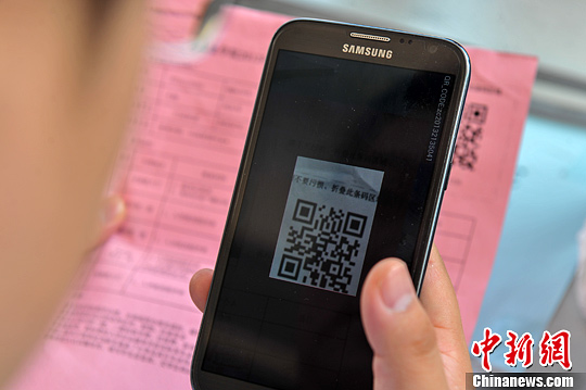 图为老师在扫描新生录取通知书上的二维码。中新社发 任东 摄