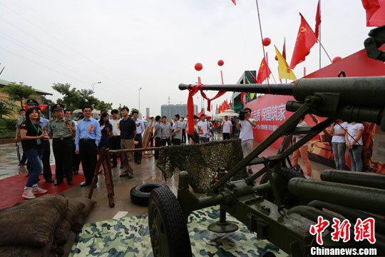 8月23日,国防兵器展在广东惠州开幕,中国国防尖端武器“歼-10”战斗机、5套履带式坦克、3辆装甲车、3门高炮、1组海红七防空导弹等重型兵器,以及辽宁号航母、歼-20战斗机等若干武器模型在广东惠州亮相,吸引大批市民冒雨前来观赏。中新社发 刘述贵 摄