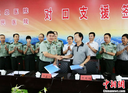 8月23日,四川阿坝州理县人民医院和成都军区总医院成功签订了“军队医院对口支援西部地区县医院”协议。图为签订仪式现场。中新社发 肖笛 摄