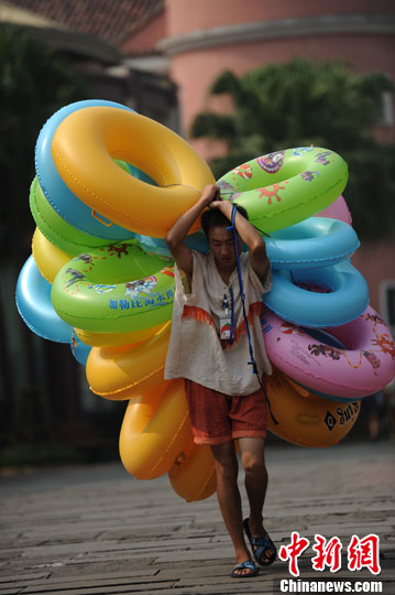 重庆高温 街头商贩扛大量泳圈