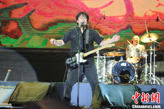 8月23日,为期三日的湖南凤凰边城音乐节在凤凰民族体育中心开幕。图为布衣乐队献唱。杨华峰 摄