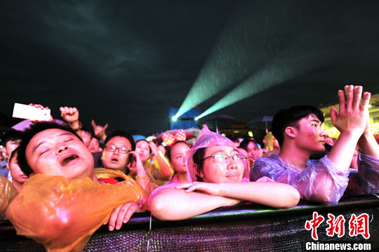 8月23日,为期三日的湖南凤凰边城音乐节在凤凰民族体育中心开幕。图为歌迷如痴如醉。杨华峰 摄