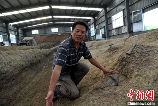 8月26日,中国科学院古脊椎动物与古人类研究所研究员汪筱林,在他领衔团队2010年发现的莱阳南郊金刚口2号恐龙化石遗址上,介绍这处遗址发现发掘进展情况,这里已发现大量距今约8000万年白垩纪的恐龙骨骼和恐龙蛋化石,发掘、研究工作一直持续开展。中新社发 孙自法 摄