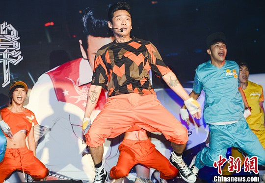 图为杜德伟现场演唱最新主打歌曲《想要快乐》,精湛舞技再次征服现场媒体和歌迷,展现出杜德伟独特演出魅力。中新社发 刘震 摄