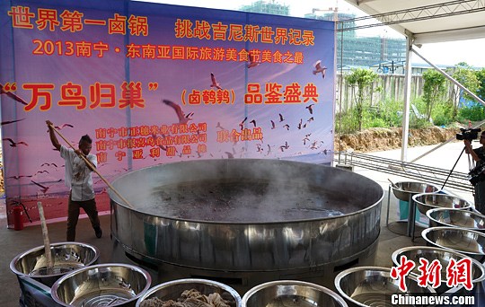由南宁市人民政府主办的2013南宁·东南亚国际旅游美食节将于8月31日至9月6日在南宁华南城举行,届时南宁市将推出美食之最“万鸟归巢——世界第一大卤锅”。这款美食项目由直径为3.6米的主锅和10个小锅组成,采用新鲜食材鹌鹑和宫廷秘制卤水秘方,卤制素有“天上飞的人参鸟”之称的鹌鹑,以世界最大的卤锅挑战美食吉尼斯纪录。