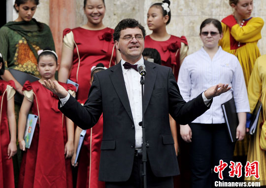 8月27日,“祝福彭州·唱颂和平”——世界和平合唱团2103彭州音乐会在白鹿镇举行。图为世界级合唱指挥大师杰拉尔德·维尔特在音乐会现场。安源 摄