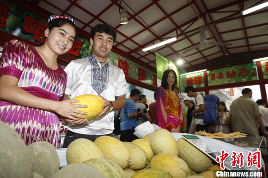 8月28日,来自新疆哈密地区的50吨精品哈密瓜在北京王府井商业街与北京市民见面,并将配送到北京市区近100家销售点同步进行销售。中新社发 杨可佳 摄