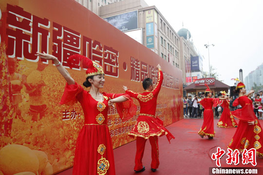 8月28日,来自新疆的青年载歌载舞,在北京王府井街头推介哈密瓜,当日新疆哈密地区的50吨精品哈密瓜在北京王府井商业街与北京市民见面,并将配送到北京市区近100家销售点同步进行销售。中新社发 杨可佳 摄