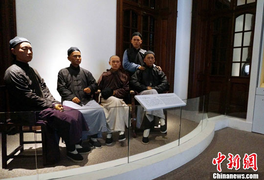 8月28日,孙中山纪念馆位于香港中环卫城道7号,前身是有90多年楼龄“甘棠第”,被列为法定古迹。纪念馆是香港历史博物馆的分馆,介绍孙中山的生平及他与香港的关系。图为“四大寇”与关景良合照复原场景。中新社发 洪少葵 摄
