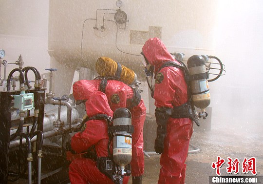 8月28日,为提升处置危化品灾害事故的能力,福建龙岩市上杭县公安消防大队组织官兵深入上杭县中阳天然气储罐站展开了一次天燃气泄漏事故救援实战演练。袁宁勤 摄