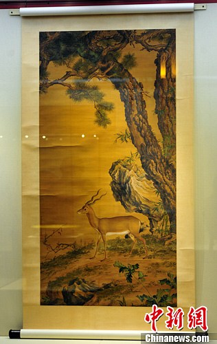 8月28日,清朝画家郎世宁的《设色竹荫西狑图轴》画作在沈阳故宫博物院展出。当日,沈阳故宫博物院推出《盛京遗珍——沈阳宫博物院珍宝展》,53件国宝级展品首次亮相,观众可以一睹“镇馆之宝”真颜。中新社发 于海洋 摄