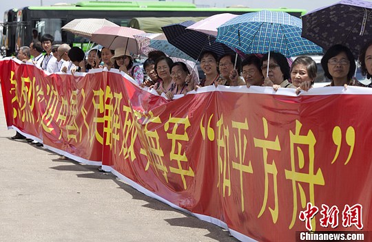 8月28日,当地华人华侨打出横幅欢迎和平方舟。中新社发 张浩 摄