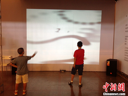 图为“水墨戏剧”展区,随着观众在镜头前手舞足蹈,一段古典音乐应运而生,一副泼墨画便会显现在白色屏幕上。宗晨亮 摄