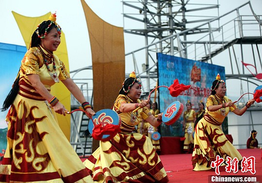 图为成都五福桥社区红缨艺术团表演《太阳鼓》。刘良伟 摄