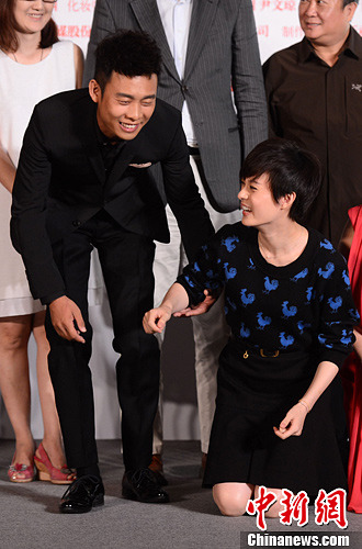 8月28日,演员孙俪跪地拍照,张译搀扶孙俪“平身”。中新社发 李学仕 摄