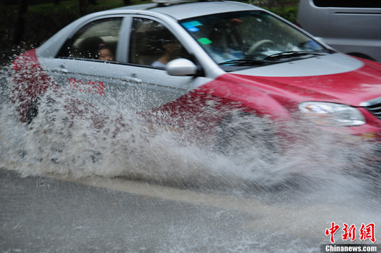 8月31日下午,深圳市气象台发出黄色雷电、橙色暴雨信号,市区再次出现强降雨,气候突变给市民出行带来不便。中新社发 陈文 摄