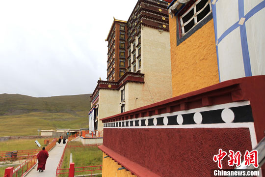 9月3日下午,一位僧人正经过贡萨寺的大殿。中新社发 胡友军 摄