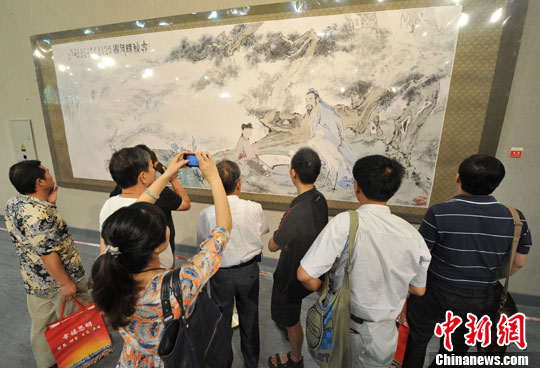 9月5日,2008奥林匹克美术大会特邀艺术家范曾的作品《弈秋课徒图》在厦门展出。中新社发 张斌 摄