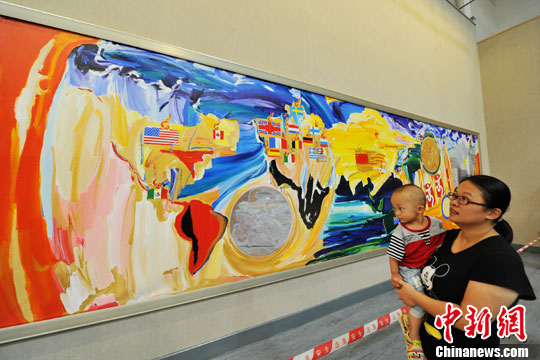 9月5日,由国际著名华裔色彩主义印象派画家墨客创作的长10米、宽2米,市场价高达1.6亿元的大型油画作品《奥运北京》在厦门展出。中新社发 张斌 摄