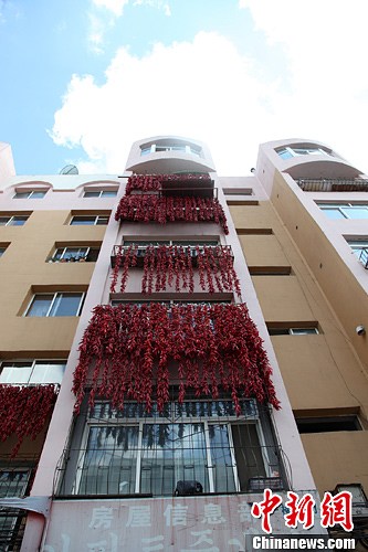 9月5日,吉林市一小区内,一串串红辣椒穿成串儿,挂满墙体,形成一道别致的秋日风景。苍雁 摄