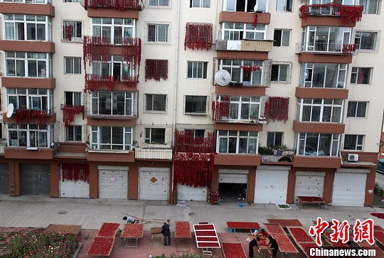 秋意渐浓,吉林市华滩小区内辣椒飘香,一串串红辣椒穿成串儿,挂满墙体,形成一道别致的秋日风景。据了解,吉林市华滩小区系朝鲜族居民居住地,小区内居民多半为朝鲜族。每逢秋季,居民家家都晒起红辣椒,将红辣椒穿成串,挂在楼体上,或在小区前的空场处晾晒。走进小区,椒香扑面,处处留红。