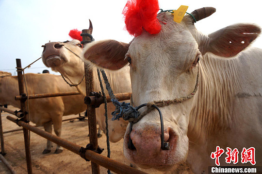 图为已佩戴红花、做好选美准备的夏南牛,将按品种最纯、体形最美,评选出最美“牛王”。周小云 摄