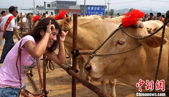 图为一位前来观赛的市民与获奖夏南牛“比美”。高予妍 摄