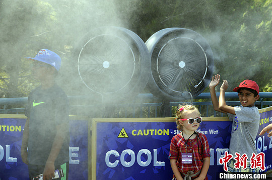 当地时间9月6日,洛杉矶儿童在环球影城的降温风扇前躲避暑热。美国南加州圣盖博谷等地气温持续突破100华氏度(摄氏37度以上),市民饱受高温煎熬。中新社发 毛建军 摄