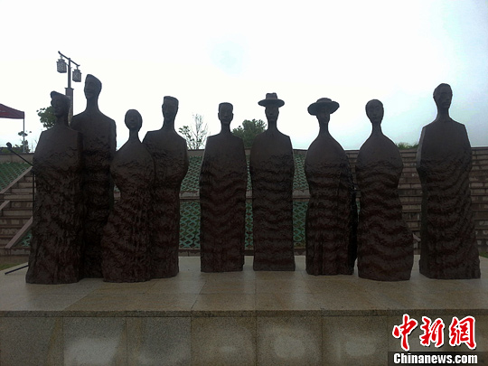 9月7日,祖籍浙江海宁的现代著名诗人徐志摩与友人观潮的雕塑在海宁盐官观潮城揭幕。中新社发 邵思翊 摄